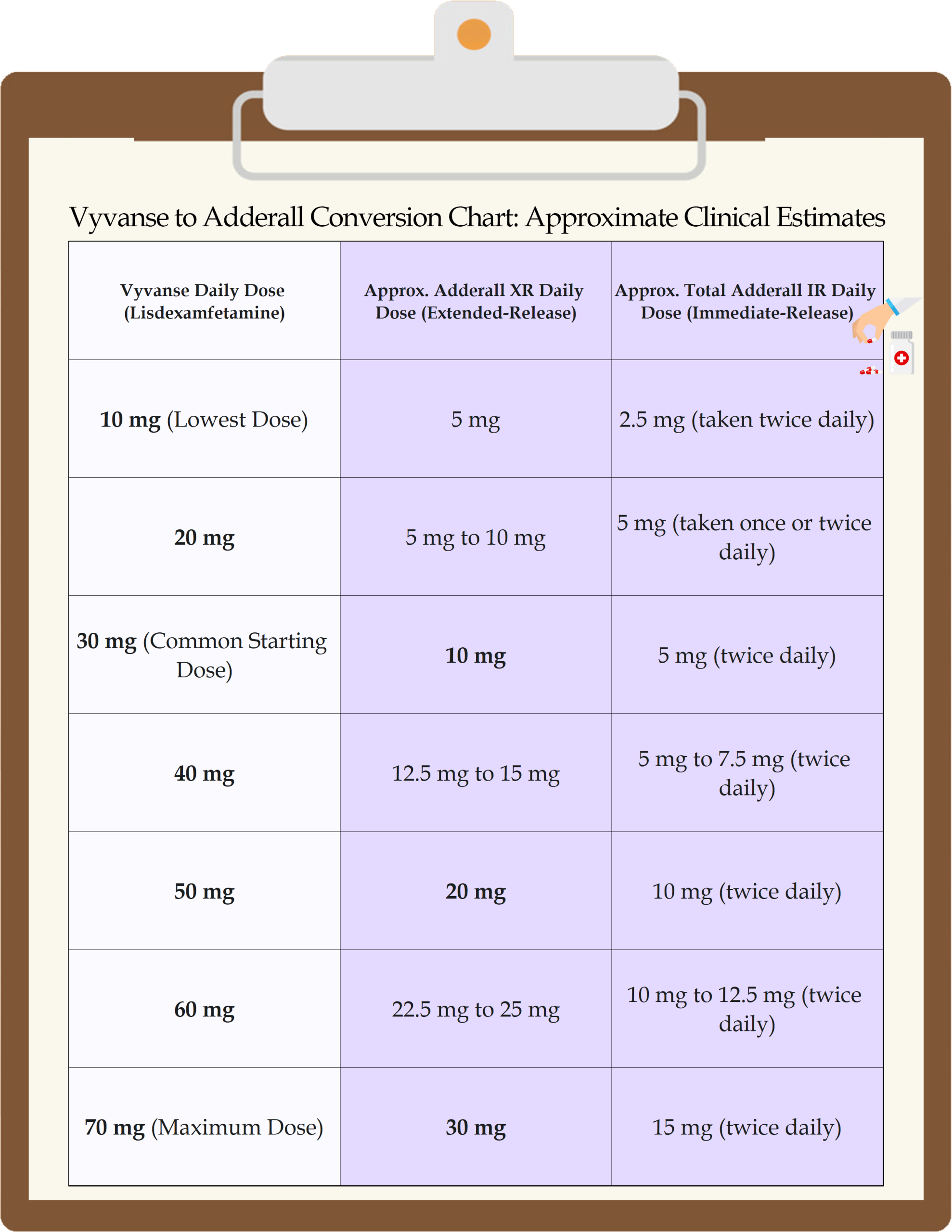 These are approximate educational Vyvanse to Adderall conversions. Individual response varies, and any dosage adjustment must always be guided by a licensed clinician. Keep our Vyvanse to Adderall conversion chart handy for reference or pharmacology review sessions, especially when studying stimulant equivalencies or comparing dosing conversions in academic or clinical settings.