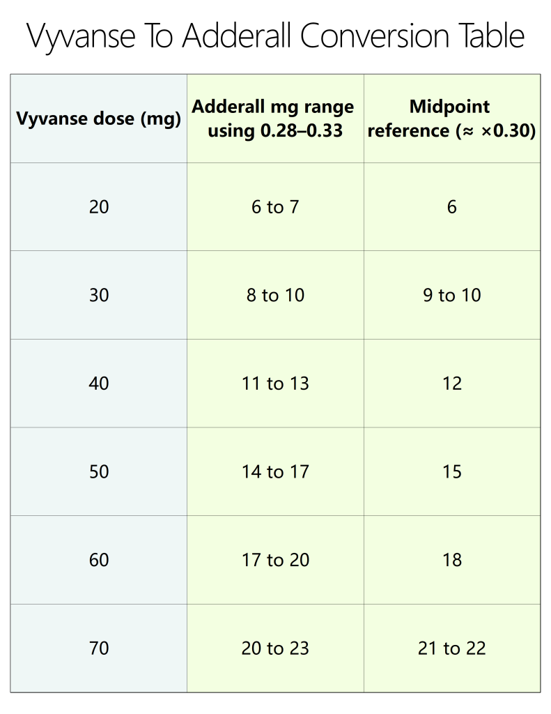 For comparison in educational discussions, the general Vyvanse to Adderall conversion formula often referenced is