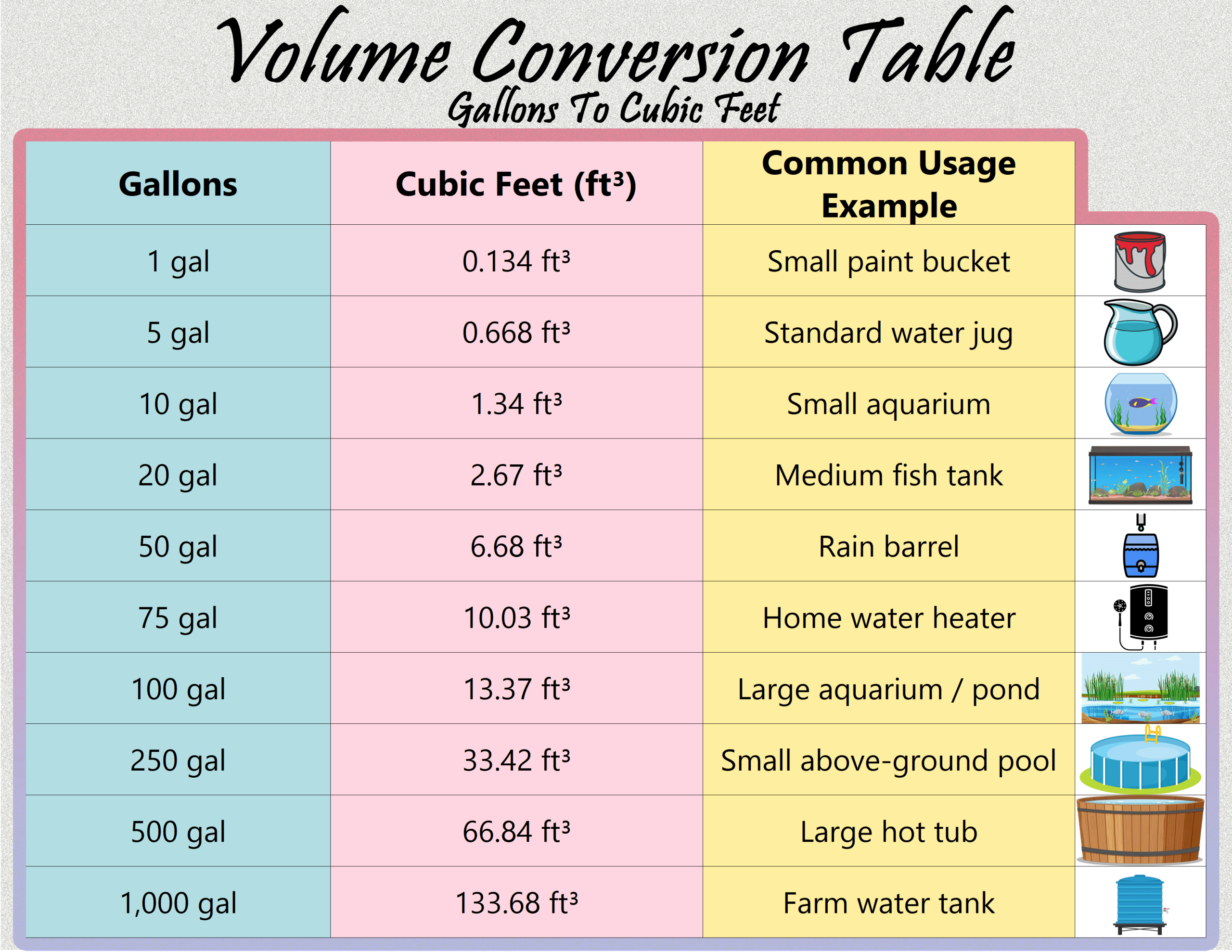 - Use it for real-world projects: planning water tanks, swimming pools, or even landscaping projects gets easier when you can see the gallon-to-cubic-foot values right in front of you.
