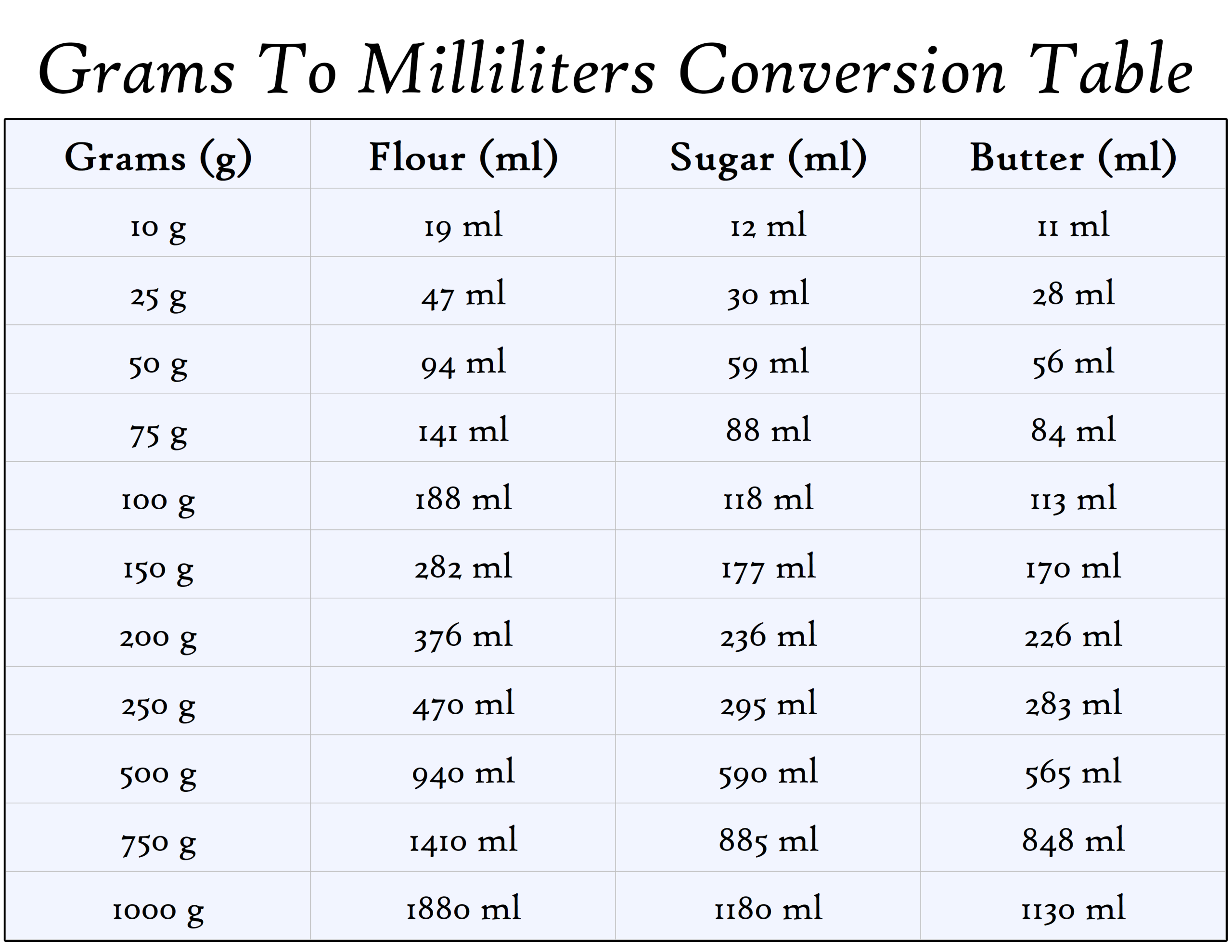Printable Grams (G) To Milliliters (mL) Conversion Chart To Convert Measurements Quickly