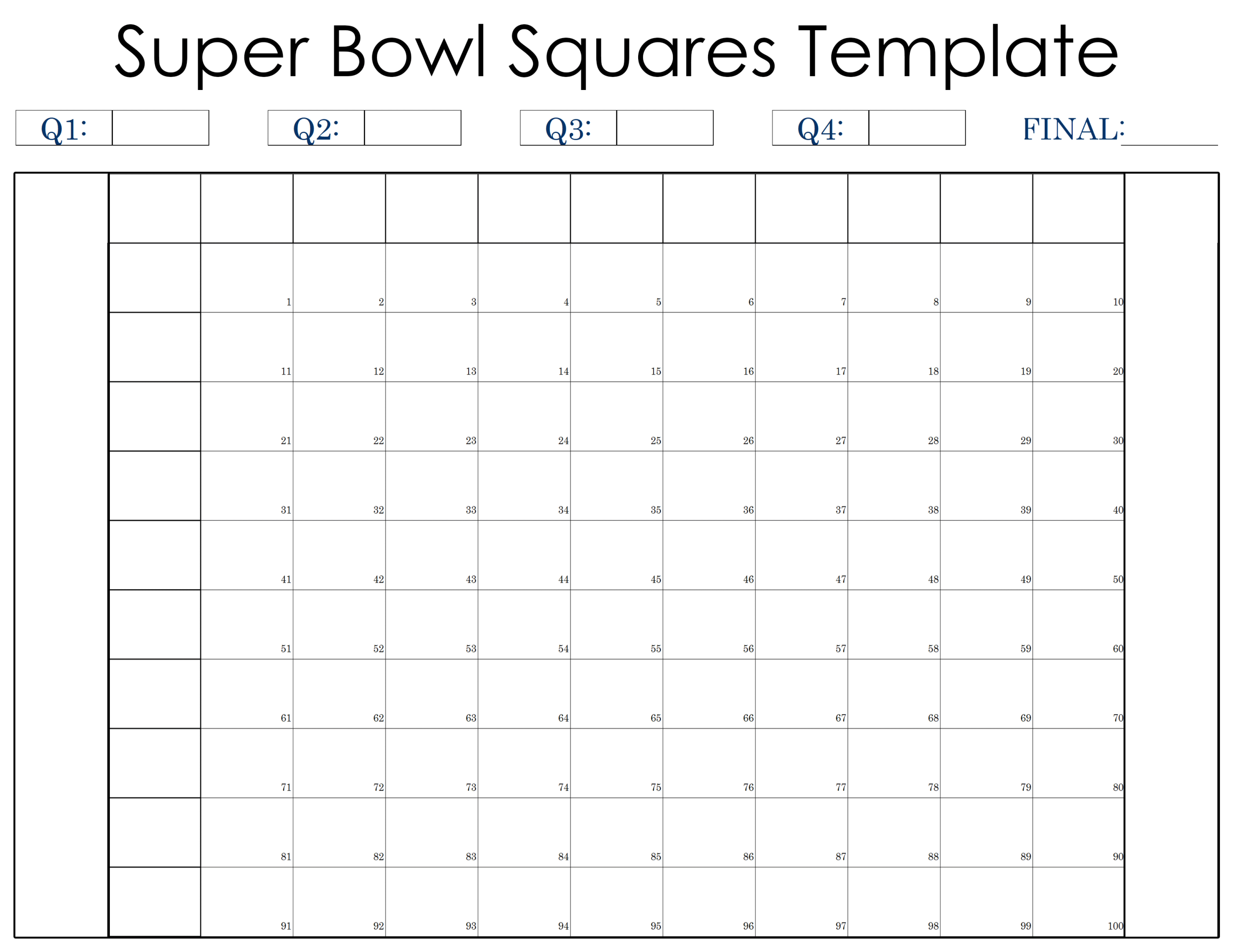 - A numbered 1–100 Super Bowl squares template with built-in score tracking for every quarter. Perfect for large office pools and organized game-day betting.