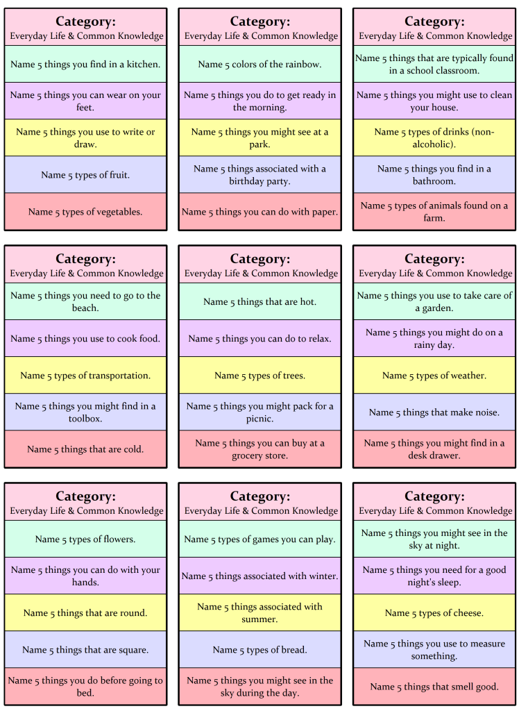 The first three templates in this printable card set include a total of 27 cards, each with 5 unique categories. That means you’ll have 135 categories to play with, offering tons of variety and keeping the game fresh. Categories range from easy, more general-knowledge questions like “Name 5 animals that live in water” to trickier ones (depending on your interests) like “Name 5 superheroes.” The mix of categories makes this game fun for all ages, so whether you’re playing with younger kids or your group of friends, everyone can get in on the action.
