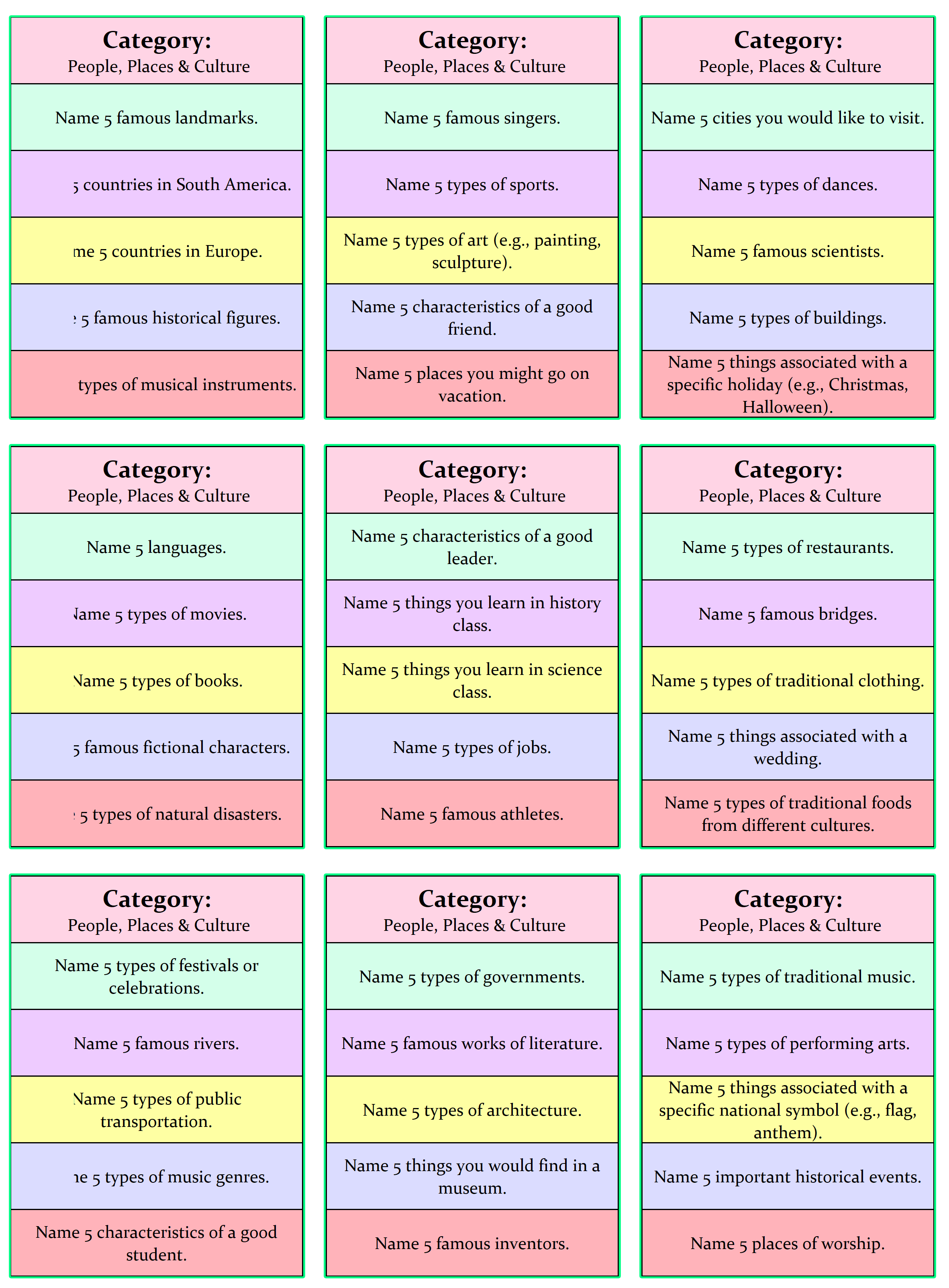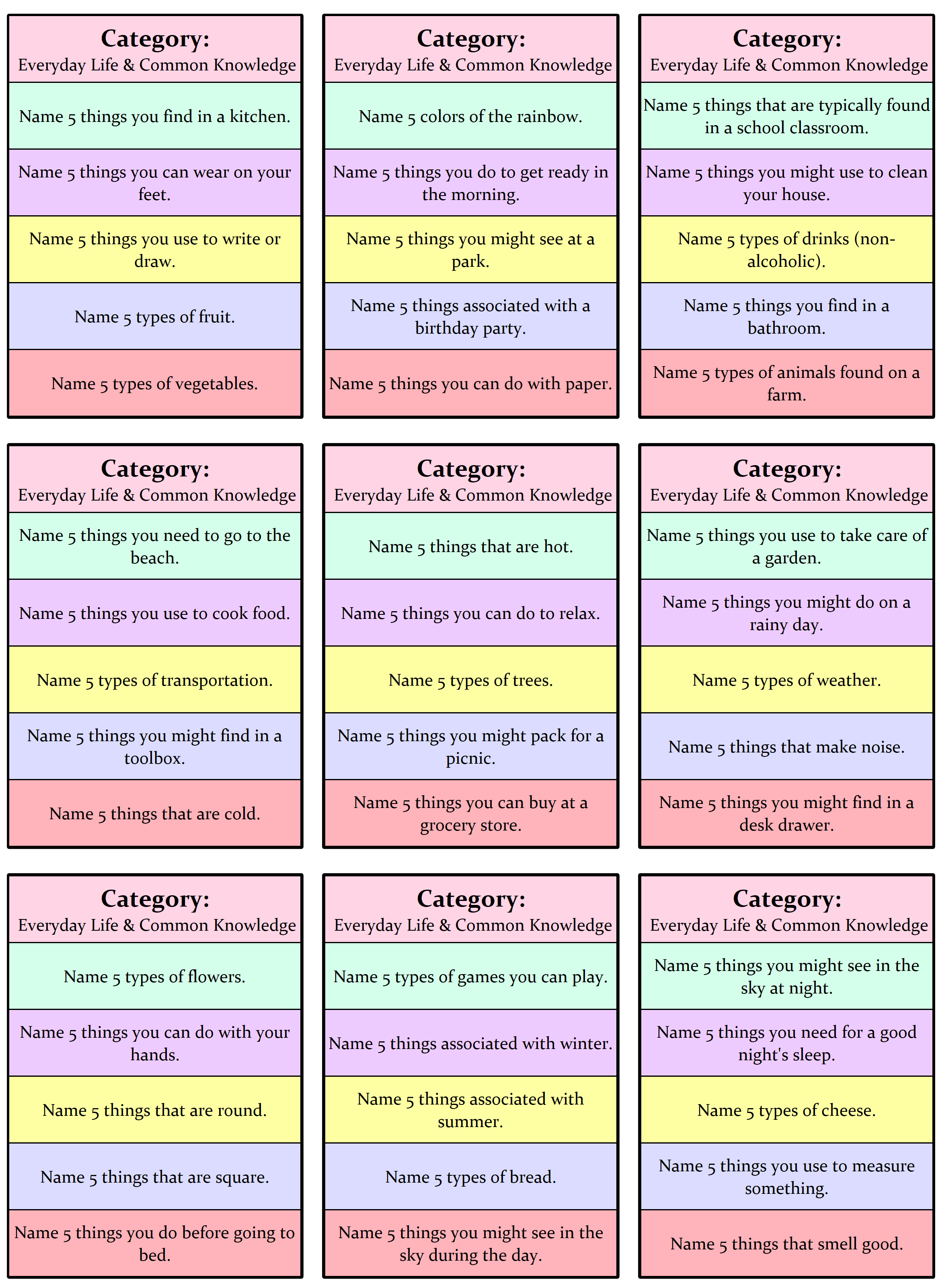 Inside each category, you’ll discover awesome prompts asking you to name five things connected to a certain theme. Imagine being challenged to list “5 things you find in a kitchen,” “5 types of fruit,” or even “5 colors of the rainbow”! You might also be asked for “5 famous landmarks,” “5 types of musical instruments,” “5 emotions,” or “5 types of shapes.” This game is a brilliant way to get everyone thinking on their feet and sharing their knowledge, making it a hit for players of all ages and in any setting.”