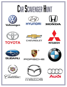 If you want to play another game about cars, try our car brand scavenger hunt! If you are a car aficionado, you can guess without seeing the logo, but we’ve provided images here for additional help. Feel free to add other brands as you see them, especially if one make is more common in the area.