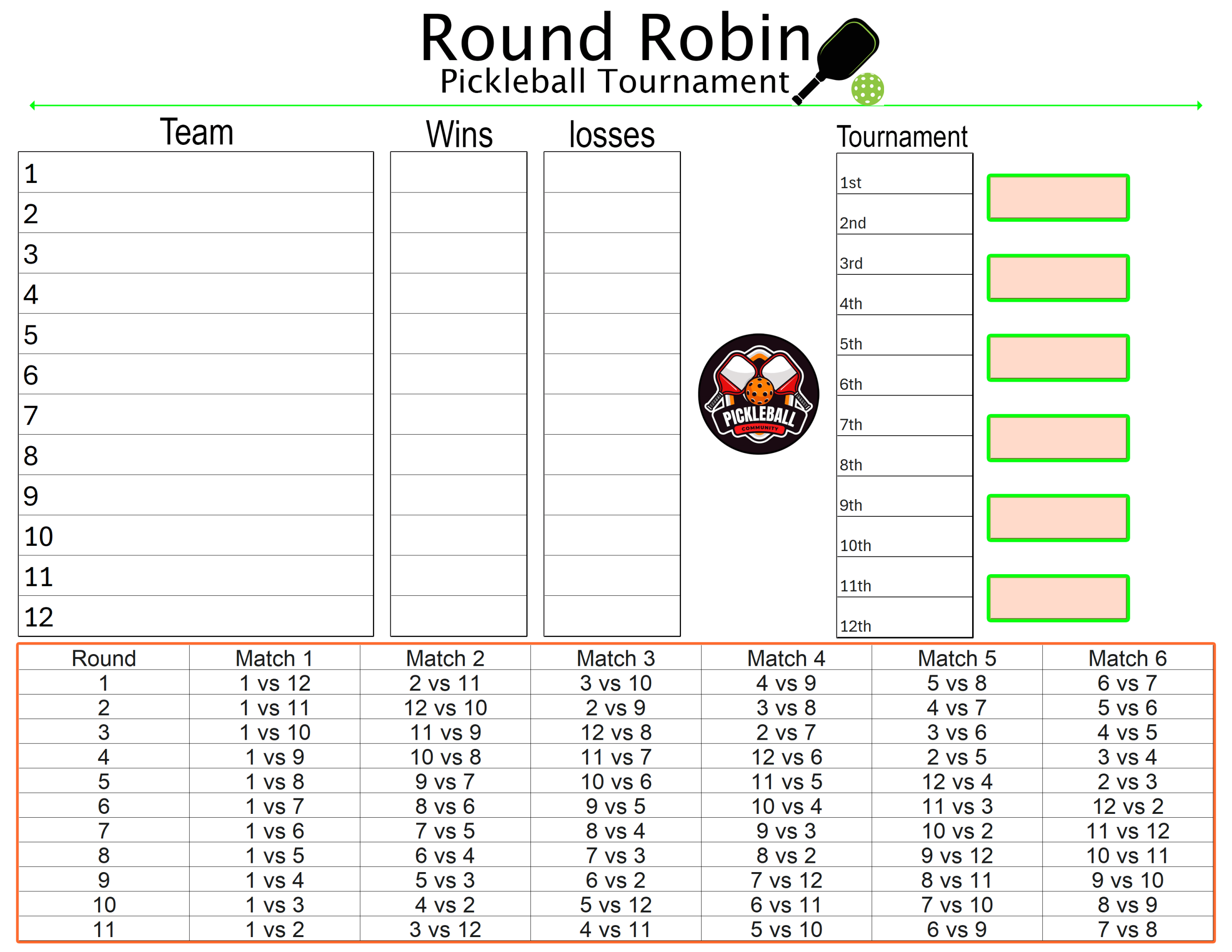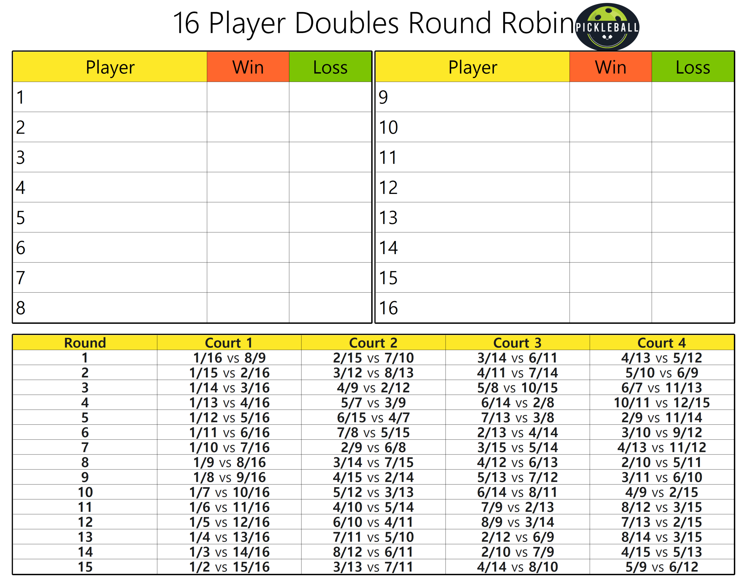Printable Pickleball Round Robin Brackets for 8, 12, and 16 Players or Teams