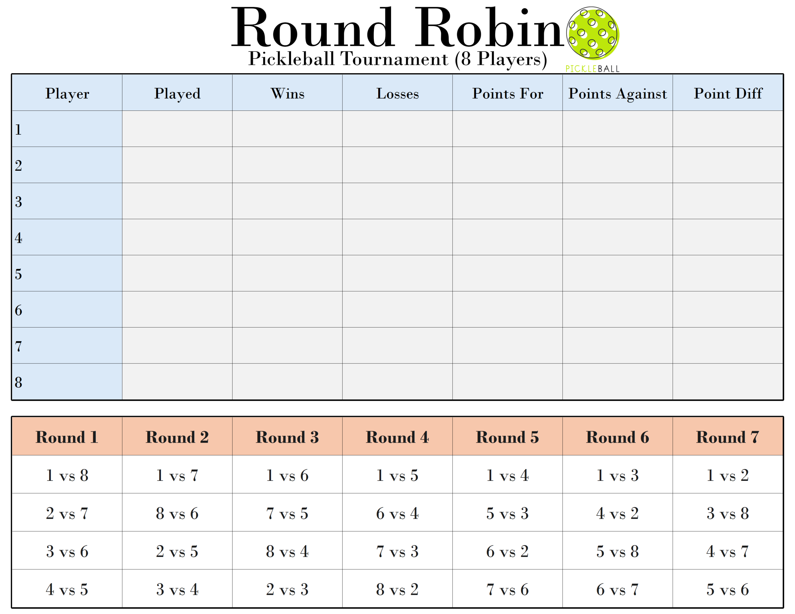 Pickleball Round Robin Bracket for 8 Teams/Players