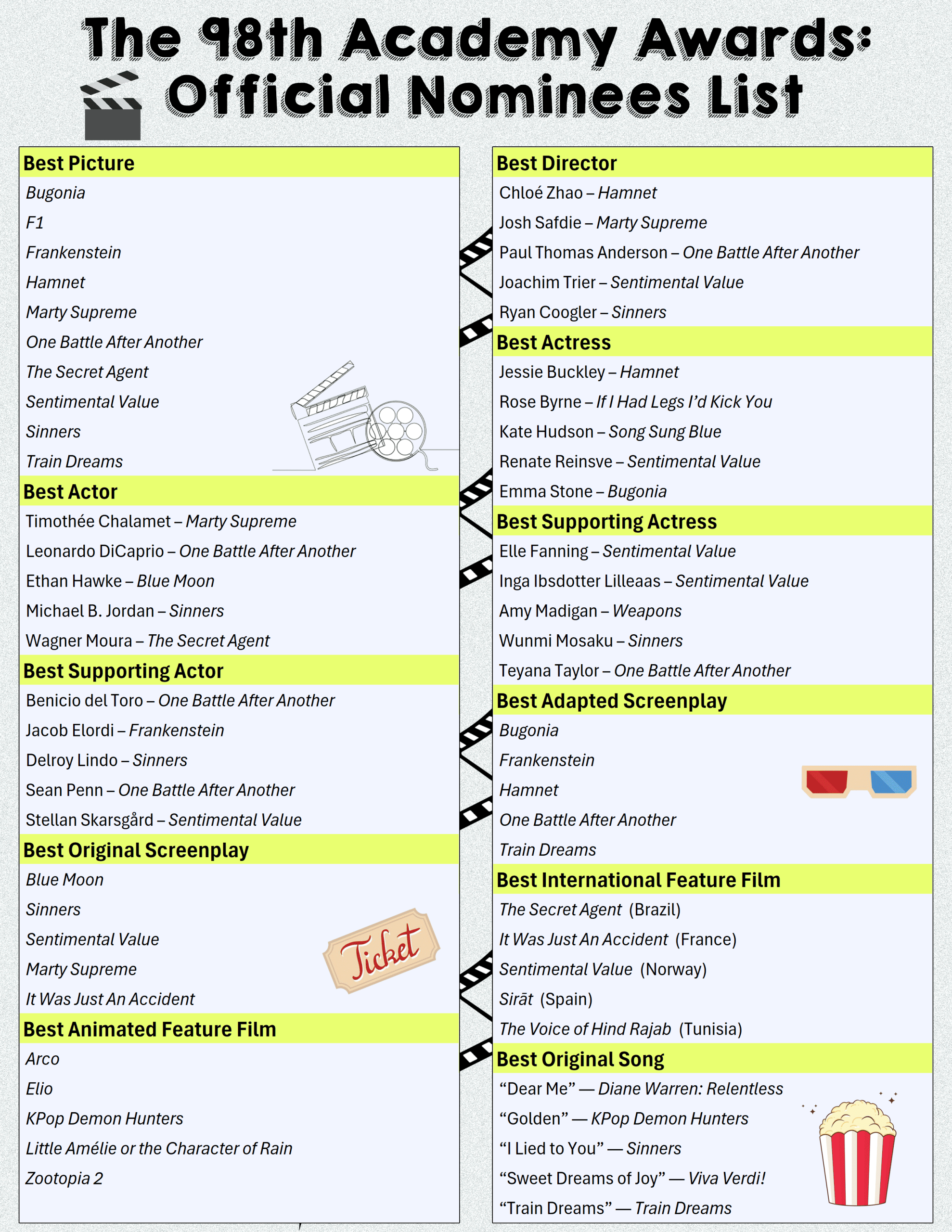 - Download: Get ready for the 98th Academy Awards with our official 2026 Oscar Nominees List. This sleek, easy-to-read tracker includes all the top categories—from Best Picture to Best Director—featuring this year’s biggest hits like Sinners, Bugonia, and One Battle After Another.