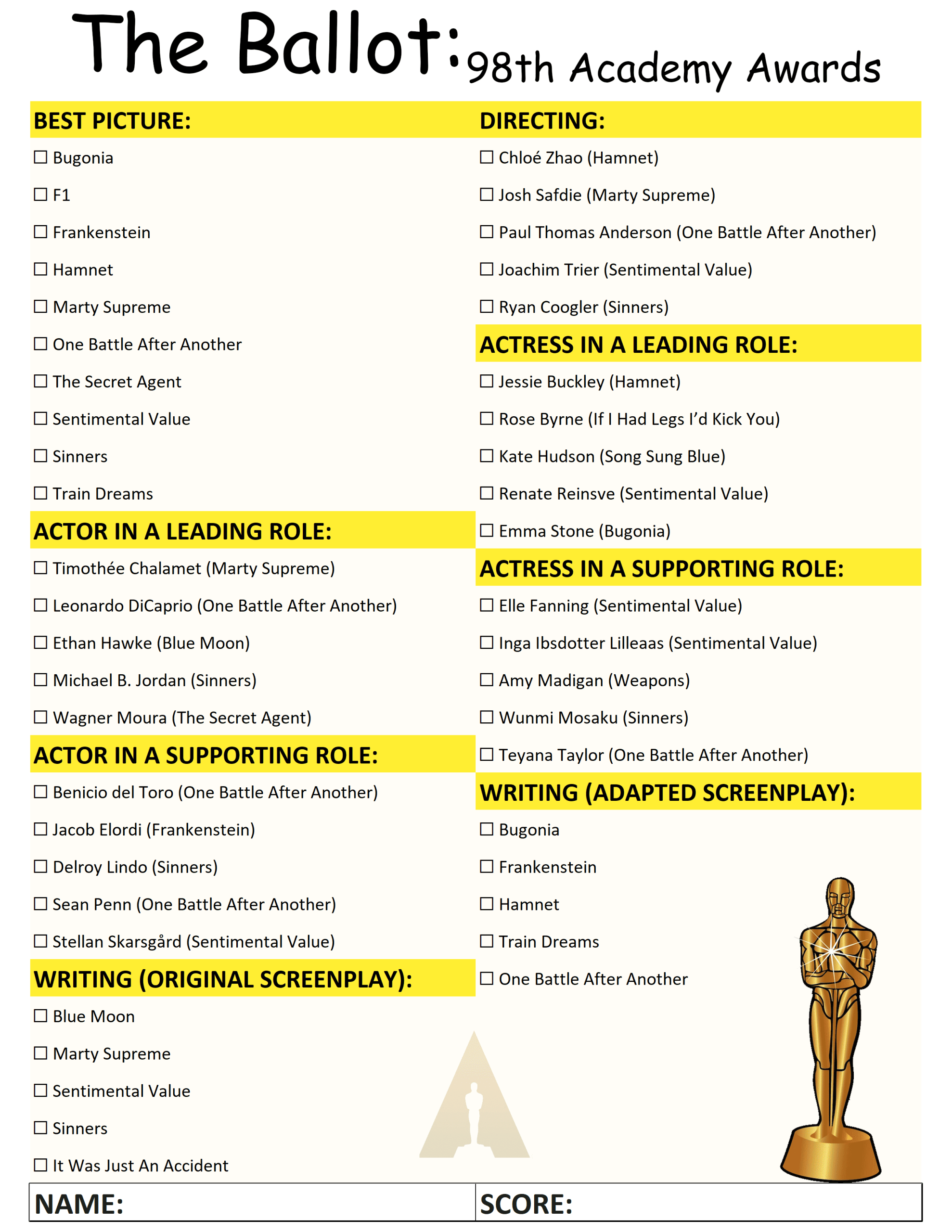- Download: Predict the winners with The Ballot for the 98th Academy Awards. This free template features major categories such as Best Picture, Directing, and Lead Acting. Follow top contenders like Bugonia, Sinners, and One Battle After Another as you track the night’s results.