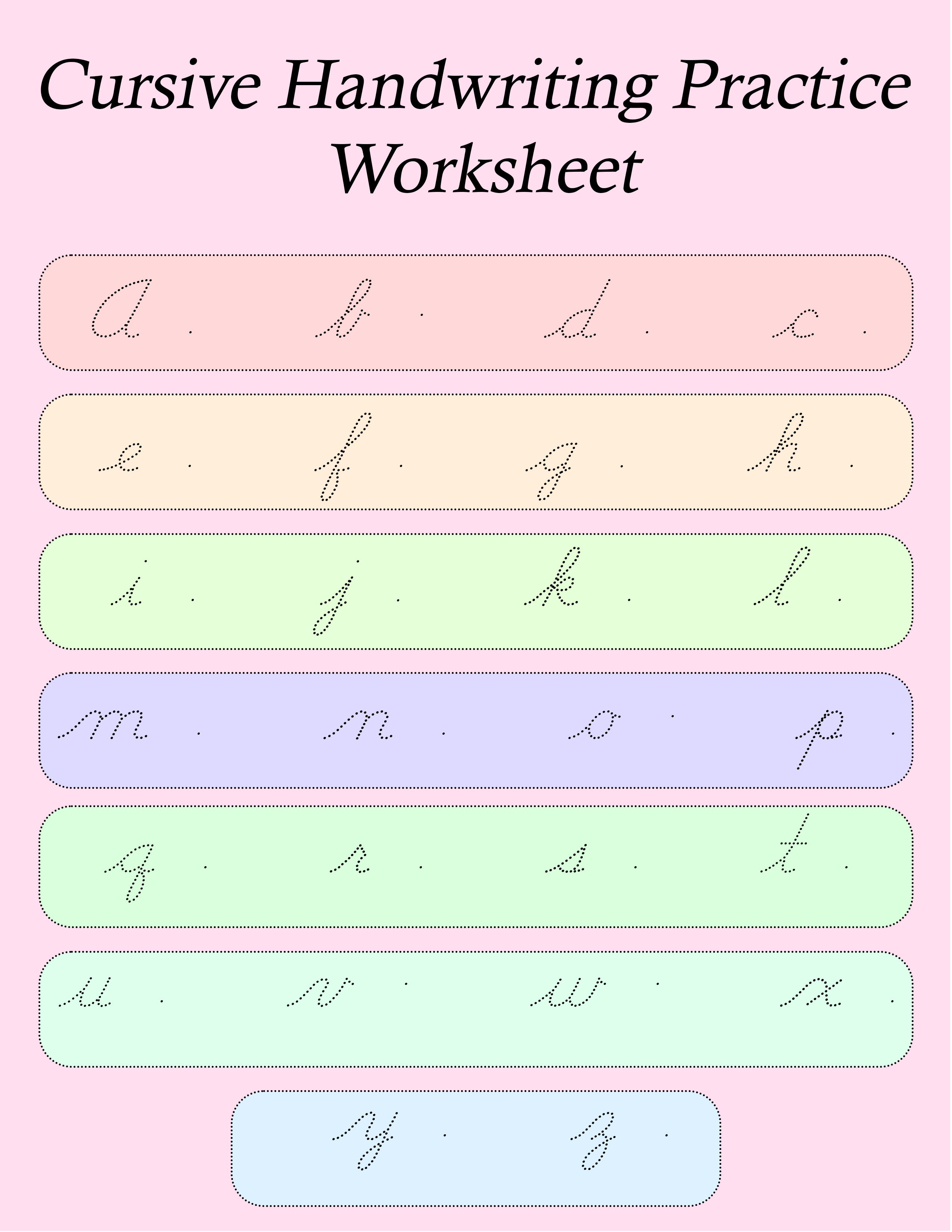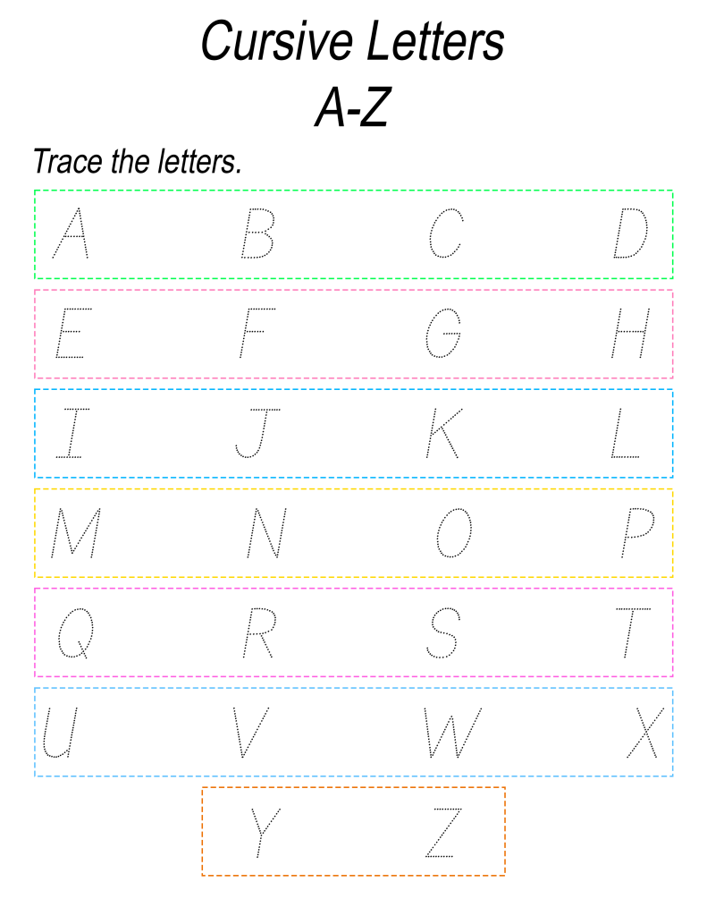 - Cursive writing A to Z practice worksheet (colorful borders).